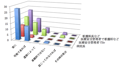 これは、院内医療文化の総括的評価のように、回答職種による違いはないが、医療安全管理者と看護師の回答傾向は酷似しており、「遺族によって対処法が変わる」と思っている回答者が合わせて11人、事象が起こってみなければわからないとした回答者は医療安全管理者2人、看護係長2人であった。この調査では、看護係長には病院名の記載を求めていないが、病床数が記載されている場合には、ほぼ病院を推測することは可能で、「起こってみなければわからない」と回答した医療安全管理者および看護係長各々1人については、同一の医療機関(X病院)の所属であった。この4人3医療機関(仮にX、Y、Z病院)については病院長のリーダーシップが疑われている、と言うべきかもしれない。